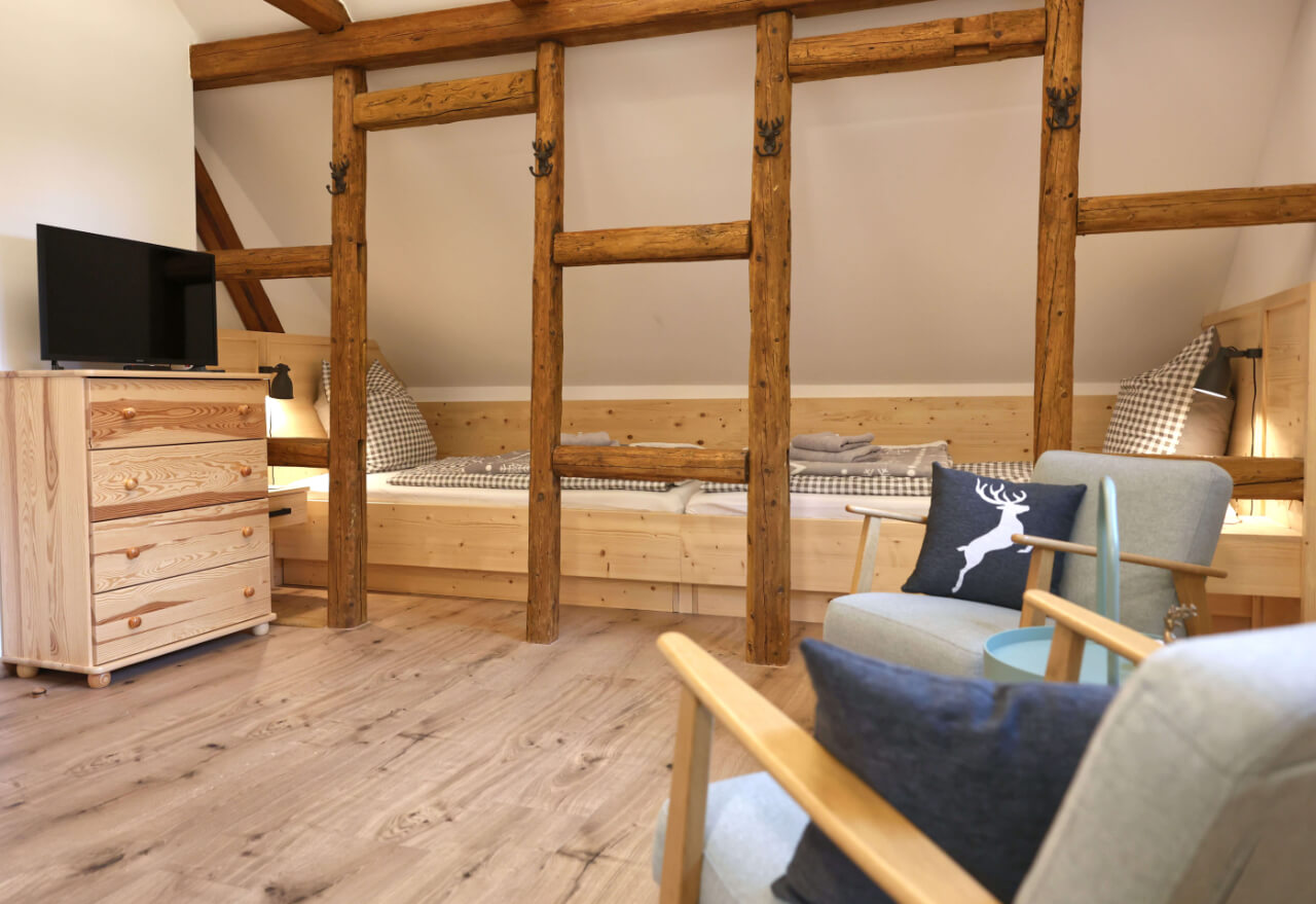 Im Berghaus zum Hirsch erwartet euch eine Ausstattung, die keine Wünsche offenlässt. Das Ferienhaus wurde mit viel Liebe zum Detail gestaltet und vereint modernen Komfort mit der gemütlichen Atmosphäre eines traditionellen Berghauses. Ob gemeinsames Kochen, entspannte Wellnessmomente, gemütliche Abende in der Partyscheune oder Aktivitäten im weitläufigen Außenbereich – hier findet ihr alles, was ihr für einen erholsamen, abwechslungsreichen und komfortablen Aufenthalt braucht.