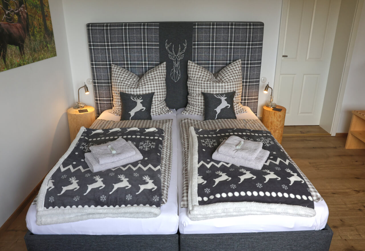 Im Dachgeschoss erwarten Dich zwei charmante Zweibettzimmer, die Gemütlichkeit und Rückzugsmöglichkeiten bieten. Eines davon verfügt über ein offenes Bad, das dem Raum eine moderne, besondere Atmosphäre verleiht.