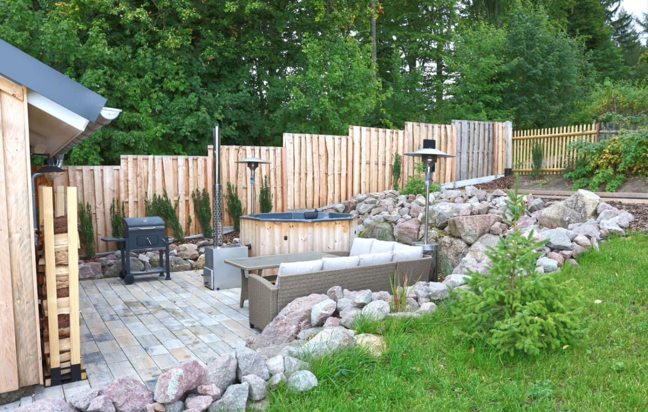 Ein mit Feuerholz beheizbarer Badezuber unter freiem Himmel sorgt für pure Entspannung.